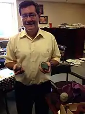 ![]() Potts displaying Oldowan stone choppers, roughly 2 million years old. These are the oldest hominin tools in the Smithsonian. | |