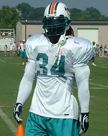 In 2009, during the Dolphins ninth game, starting running back Ronnie Brown suffered a season-ending injury,[76] and Williams, at age 32, became the starter for the remainder of the year. He finished the season with 1,121 yards rushing and a 4.7 yards per carry, along the way setting an NFL record of the longest time span (six years) between 1,000 yard seasons (2003–2009).[77] Williams also became only the seventh player in NFL history to begin a season age 32 or older and reach 1,000 yards rushing during that season.[78][79][80]