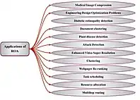 The applications of ROA are noticed in several domains that involve: Engineering Design Optimization Problems,[7] Diabetic retinopathy detection,[8] Document clustering,[9] Plant disease detection,[10] Attack Detection,[11] Enhanced Video Super Resolution,[12] Clustering,[13] Webpages Re-ranking,[14] Task scheduling,[15] Medical Image Compression,[16] Resource allocation,[17] and Multihop routing.[18] Figure 1 displays the application of ROA.