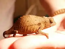 Rieppeleon brevicaudatus, commonly known as the bearded leaf chameleon or bearded pygmy chameleon,[1] is a chameleon originating from the eastern Usambara and Uluguru Mountains in northeastern Tanzania and Kenya. It is easily distinguished from others in the Rieppeleon genus by the presence of a "beard" below the mouth, consisting of a few raised scales. At a full grown length of only 3 in (8 cm), it is marked by somewhat drab coloring in comparison to other chameleons, usually assuming a brown or tan coloring. It is quite capable of changing its coloration, though, often taking on a shade to blend into the background and becoming darker when under stress. It is also capable of compressing its body laterally and producing a stripe down its side, mimicking a dead leaf. It often assumes this form when sleeping in the open. It can adopt a variety of colors, including yellow, green, orange, black, and brown. A common misconception is that these chameleons use their color-changing abilities as camouflage, but they actually use their color-changing skin to court and show stress or emotion. Males are distinguished by a longer tail, more prominent dorsal crest, slimmer body type, and persistent patterning. Like others in the family Chamaeleonidae, it is distinguished by independently rotating eye sockets and a tongue longer than its body.