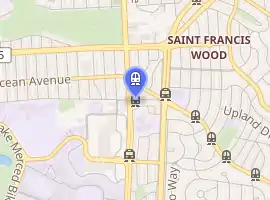 Right Of Way/Eucalyptus is a light rail stop on the Muni Metro M Ocean View line, located in the Merced Manor neighborhood of San Francisco, California. It opened in 1925 with the first phase of the line. The station is located where the line's private right-of-way crosses Eucalyptus Drive, with narrow side platforms located on the near side of the grade crossing. The southbound platform is across the tracks from the northbound platform of Right Of Way/Ocean station.