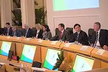The IOC Evaluation Commission arrived in Rio de Janeiro on April 27, 2009, to assess the quality of the bid, stating that the welcoming activities prepared by the city had been the best.[59] Unlike the first evaluation, the committee did not assign scores, but analyzed the probability of execution of the plans.[60] During the first two days of the visit, the Evaluation Commission held internal meetings at Copacabana Palace, the host hotel.[61] Between April 29 and 30, the Commission attended technical presentations in a large ballroom equipped with lighting and multi-media resources, where it participated in question-and-answer sessions about each of the seventeen themes presented in the Candidature File.[62] May Day was marked by the inspectors' visits to all existing venues across the city.[63] On May 2, 2009, the Evaluation Commission made a press conference to highlight the main points of the visit.[64] According to El Moutawakel, the Commission was very impressed with the unity of government support, the quality of the presentations and the level of integration of the Games in the country's long-term development plan.[65] After seven days of inspections involving 300 professionals, the thirteen members of the IOC Evaluation Commission left Rio de Janeiro on May 3, 2009, on the way to Madrid.[61] One month before the election, on September 2, 2009, Rio officials welcomed the released of the 2016 Evaluation Commission Report.[66] It gave a very positive assessment to the city and described the documents submitted by Rio de Janeiro as "of a very high quality".[60][67]