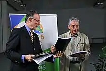 After the presentation, the session was opened for questions.[72] Nuzman clarified doubts by Arne Ljungqvist about doping legislation; Osório and Cabral answered two questions by Prince Albert of Monaco about accommodation and the project's legacy, respectively; and the President of Brazil himself responded to a question by Austin Sealy about organization risks.[71] Following the presentations by the four Candidate cities, Nawal El Moutawakel presented the report of the Evaluation Commission to the Session.[30] From a total of 106 eligible IOC members, 95 were available to vote in the first round.[74] Members from the four bidding countries were not allowed to vote until their city was eliminated.[75] Alpha Ibrahim Diallo, Kun Hee Lee, Saku Koivu and the IOC president were eligible members who did not vote.[74] Chicago fell in the first round with 18 votes, while Tokyo received 22, Rio 26, and Madrid 28.[76] In the second round, Tokyo was eliminated with 20 votes, while Madrid received 29 and Rio 46.[77] Rio de Janeiro was elected in the final round with 66 votes over 32 for Madrid.[78] The winning city was revealed by Jacques Rogge at 6:30 (CEST) during an announcement ceremony hosted by Lillian Gjerulf Kretz and Jonathan Edwards.[79] Nearly 100,000 people celebrated the victory on Copacabana beach while watching the live broadcast.[80] Following the announcement, Richard Carrión, Rogge, Nuzman and Paes signed the Host City Contract and officialized Rio de Janeiro as the host of the 2016 Olympic and Paralympic Games.[81]