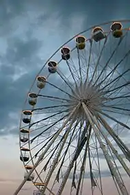 The visual identity of the candidature consisted of a logo and a slogan, which were applied in marketing moves during the campaign.[92] Designed by Ana Soter and selected among four finalists by a special jury, the logo was unveiled during the 2007 Brazilian Olympic Awards, held at the Municipal Theater of Rio de Janeiro, on December 17, 2007.[93] The Sugarloaf Mountain was chosen to be the symbol as one of the city's most famous landmarks.[94] According to the Rio de Janeiro bid committee, the design as a whole conveys a heart shape, representing Brazilian passion and enthusiasm for sports.[93] First with only the inscription "Applicant city", the logo received the Olympic rings and the label "Candidate city" after being shortlisted.[95] At midnight on January 1, 2009, the bid's slogan "Live your passion" was launched as part of the New Year's celebrations, which was attended by nearly two million people.[96] According to the Rio de Janeiro bid committee, the slogan reflected the Brazilian's way of getting passionately involved in whatever they do.[97] It was projected onto the Rio de Janeiro 2016-themed Ferris wheel after the countdown to the beginning of 2009.[98] The structure erected on Copacabana beach to promote the candidature was 36 m (118 ft 1 in) high, weighed 80 tonnes (180,000 lb) and had 24 gondolas for 144 people.[99][100]