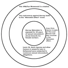 In October 2017, according to The New York Times[5][6] and The New Yorker,[7] dozens of women have accused American film producer Harvey Weinstein, former founder of Miramax Films and The Weinstein Company, of rape, sexual assault and sexual abuse for over a period of three decades. Shortly after over eighty accusations, Harvey was dismissed from his own company, expelled from the Academy of Motion Picture Arts and Sciences and other professional associations, and even retired from public view. The allegations against him results in the Weinstein effect, a global trend involving a serial number of sexual misconduct allegations towards other famous men in Hollywood such as Louis CK and Kevin Spacey.[8] The effect lead to the formation of the controversial Me Too movement, where people share their experiences of sexual harassment/assault.[9][10]