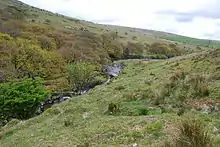 Between Stingers Hill and Redlake the river turns southward into an area known as The Meadow, where it is crossed by the Upper Erme stone row, the longest on Dartmoor at 3,320 m (10,890 ft).[6] For the next mile or more downstream from here there are extensive archaeological remains on the river's banks, most notably Erme Pound (the highest and largest Bronze Age enclosure in the area),[7] Downing's House (a well-preserved "tinner's cache" or "beehive hut" with much of its roof preserved),[8] and a number of tinner's huts and blowing houses.