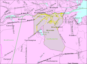 Riverside is in the Town of Southampton and derives its name from being on the south bank of the Peconic River.