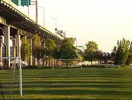The park contains site-specific sculptures, railway ruins, gardens, a waterfront promenade, and a walkway.[83] Portions of the former rail yard, such as the New York Central Railroad 69th Street Transfer Bridge, were incorporated into the new park.[1][79][80] The transfer bridge was listed on the National Register of Historic Places in 2003.[84] Nearly a dozen rail yard ruins, such as a burnt warehouse frame, were ultimately integrated into the park.[80] As a reminder of the location's history, New York Central Railroad logos are engraved onto park benches.[80] A block away, on West End Avenue, a privately owned park has a remnant of a stone wall, as a remaining part of the embankment that dated to 1847. Construction workers had unearthed the stones during construction in 1994; some stones were salvaged for the new park during the four-day construction hiatus for archaeological excavation.[2]