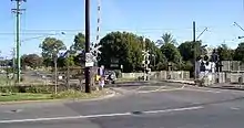 Riverstone is one of the few suburbs left in the Sydney region with a level crossing with old-fashioned boom gates. This view looking west onto the undeveloped flood-prone paddocks is popular with Sydney film and TV commercial makers as a stand-in for a small country railway station. The final parting scene in the film Beneath Clouds was shot there.