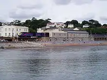 The train now descends this to reach Torquay railway station opened in 1859, although today's large stone buildings and old signal box date from 1878.[14] Unlike the original Torquay station (now Torre), this one is right by the beach at Abbey Sands and a level promenade links it with the harbour and town centre.