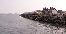 A little further along the river the railway crosses the mouth of Cockwood harbour. Near the shipwreck here was the 1,285 feet (392 m) long Exe Bight Pier, in use from 1869 for about ten years.[3] Dawlish Warren now comes into sight; the sand dunes are home to a nature reserve where many wading and sea birds can be seen. The railway line opens out into four lines at Dawlish Warren railway station, where the platforms are alongside loop lines that allow fast trains to overtake stopping services.