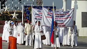 The Rizalista religious movements refers to the new religious movement and a form of Folk Catholicism adopted by a number of ethnic religious groups in the Philippines that believe in the divinity of Jose Rizal, the Philippines' de facto national hero. Many of these sects or religious movements believe that Rizal is still living and that he will deliver his followers from oppression and poverty. Rizalist groups have differing views on the divinity of Jose Rizal. Some believe that he is God himself, some believe that Rizal was the second son of God, the reincarnation of Christ. Some of these groups also identify Rizal as the god of the pre-Spanish Malay religion.[1] Some only see as Rizal as a spiritual guide.[2] Leaders of the sect often claim that key people in the Philippine Revolution including Rizal himself were reincarnation of the Virgin Mary. Many of these groups claim that the only key to salvation is by joining their group.[3]