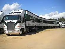 A road train, land train or long combination vehicle is a trucking vehicle used to move road freight more efficiently than semi-trailer trucks. It consists of two or more trailers or semi-trailers hauled by a prime mover.[1] Long combination vehicles[2] are combinations of multiple trailers on tractor trucks as compared to standard 5 axle semi trailer-trucks with one trailer.