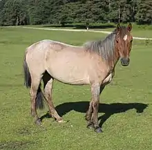 Blue dun or grullo (also grulla, mouse dun) coloring is created by the dun gene acting on a black base coat, is a coat color with a bluish cast and darker points.[13] Unlike blue roans, grullos are solid color and appear bluish due to low amounts of pigment in each hair, not interspersed white hairs.[14] Like other dun coat colors, grullos have dark or black primitive markings, always including a stripe down the back.[14]