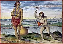 The first attempted settlement was headed by Ralph Lane in 1585. Sir Richard Grenville had transported the colonists to Virginia and returned to England for supplies as planned. The colonists were desperately in need of supplies, and Grenville's return was delayed.[10] While awaiting his return, the colonists relied heavily upon a local Algonquian tribe.[11] In an effort to gain more food supplies, Lane led an unprovoked attack, killing the Secotan tribe's chieftain Wingina and effectively cutting off the colony's primary food source.[11]