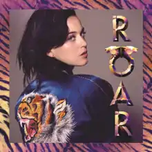 Perry announced "Roar" would be the first single from Prism with the release of a video teaser featuring the singer burning a blue wig.[12] More video teasers were released onto YouTube, showing Perry at a funeral with a coffin decorated with the singer's famous pink and white pinwheels dress,[13] and entering a recording booth while dressed with a "throwback" jacket featured in the single's cover art,[14] which was revealed on August 8, 2013.[14] It features a tiger print border around Perry, who wears a blue Japanese silk sukajan jacket, with the image of a tiger printed on its back.[15] On the same day of the song's digital release, a lyric video for it, produced by Joe Humpay, Aya Tanimura, Tim Zimmer, and Tuan Le, was released onto YouTube. It primarily shows Perry doing daily activities such as eating breakfast, going to the bathroom, and taking a bath, while texting the lyrics of "Roar" to friends. Some words are substituted with various Emoji characters.[16][17] It was target of plagiarism accusations by music producer Dillon Francis, who felt it copied the concept of instant messaging from his video entitled "Messages".[18]