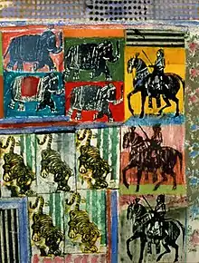 Brokl's later printmaking—like his painting—explores travel, animals and pets, and art itself and often combines woodblock printing, drawing, collage, painting and stencils (e.g., 9 Roosters, 2004; Weller Frog and Albers Painting, 2011; or David, 1992).[3][26][44][45][13] India XIII (1996) offers a characteristic work in this vein, with a layered, gridded format combining expressive gesture and crudeness in its repeated tiger, rider and elephant images and delicacy in its flower, rabbit and abstract woodblock patterns created with Indian fabric printing blocks.[46]