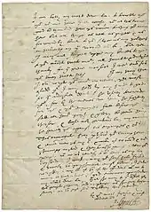 After the Armada the Earl was seen riding in splendour through London "as if he were a king",[243] and for the last few weeks of his life he usually dined with the Queen, a unique favour.[243] On his way to Buxton in Derbyshire to take the baths, he died at Cornbury Park near Oxford, on 4 September 1588. Leicester's health had not been good for some time; historians have considered malaria and stomach cancer as causes of death.[244] His death came unexpectedly,[4] and only a week earlier he had said farewell to Elizabeth. She was deeply affected and locked herself in her apartment for a few days until Lord Burghley had the door broken.[245] Her nickname for Dudley had been "Eyes", which was symbolised by the sign of ôô in their letters to each other.[246] Elizabeth kept the letter he had sent her six days before his death in her bedside treasure box, endorsing it with "his last letter" on the outside. It was still there when she died 15 years later on 24 March 1603.[247]