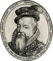 Robert Dudley was the fifth son of John Dudley, Duke of Northumberland, and his wife Jane, daughter of Sir Edward Guildford.[4] His paternal grandfather, Edmund Dudley, had been an adviser to King Henry VII and was executed for treason in 1510 by King Henry VIII. John and Jane Dudley had 13 children in all and were known for their happy family life.[5] Among the siblings' tutors figured John Dee,[6] Thomas Wilson, and Roger Ascham.[7] Roger Ascham believed that Robert Dudley possessed a rare talent for languages and writing, regretting that his pupil had done himself harm by preferring mathematics.[8] Robert learned the craft of the courtier at the courts of Henry VIII, and especially Edward VI, among whose companions he served.[9]