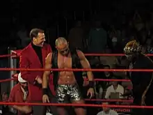 On March 27, 2010, Evans made his debut for Ring of Honor (ROH), working in a dark match, where he, David E. Jones and Ryan Stone were defeated by Johnny Goodtime, Johnny Yuma and Mike Sydal.[12] On January 22, 2011, Evans, under the ring name "Barrister" R.D. Evans, made his television debut at the Ring of Honor Wrestling tapings, where he was unveiled as one of the new members of Prince Nana's The Embassy stable.[13] Though he has not wrestled a single match for ROH since his dark match, Evans has been a part of several storylines involving The Embassy, including filing a lawsuit against Homicide, accusing him of attempted murder, assault and battery, attempted sexual assault and battery, sexual harassment and intentional infliction of emotional distress,[6][14] and making various business deals for the stable, including one that resulted in its name being changed to The Embassy Limited, all with a goal of making Tommaso Ciampa a champion.[6][15] However, after Prince Nana struck a deal with Truth Martini and cost Ciampa his match for the ROH World Television Championship against House of Truth member Roderick Strong, Ciampa turned on Nana at the June 29 tapings of Ring of Honor Wrestling,[16] dissolving The Embassy Limited and making Evans his new primary manager.[17][18] Evans continued managing Ciampa until August, when Ciampa was sidelined with a torn anterior cruciate ligament (ACL).[19][20][21]