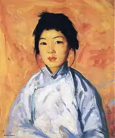 In 1898, Henri married Linda Craige, a student from his private art class. The couple spent the next two years on an extended honeymoon in France, during which time Henri prepared canvases to submit to the Salon.[13] In 1899 he exhibited "Woman in Manteau" and La Neige ("The Snow"), which was purchased by the French government for display in the Musée du Luxembourg.[14] He taught at the Veltin School for Girls beginning in 1900[15] and at the New York School of Art from 1902, where his students included Joseph Stella, Edward Hopper and his future wife Josephine Nivison, Rockwell Kent, George Bellows, Norman Raeben, Louis D. Fancher, and Stuart Davis. In 1905, Linda, long in poor health, died.[14] Three years later, Henri remarried; his new wife, Marjorie Organ, was a twenty-two-year-old cartoonist for the New York Journal.[16] (Henri's 1911 portrait of Marjorie, The Masquerade Dress, is one of his most famous paintings and hangs in the permanent collection of the Metropolitan Museum of Art.)