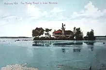 There was a cottage on the island by 1893, and there is some disagreement on whether or not Wright had something to do with its construction.[1] By the turn of the century, several cottages were constructed on the small island and it is known that in 1901–02, Wright tied the cottages together into one structure,[2] which is the known cottage for Robert Lamp that appears in postcards and photographs. The cottage was a two-story tall building with horizontal siding and a wrap-around porch on the second floor. In 1902–03, a windmill was added on the island to bring water to the cottage.