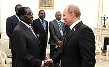 In response to the violence, Tsangirai pulled out of the run-off.[214] In the second round, Mugabe was pronounced victor with 85.5% of the vote, and immediately re-inaugurated as President.[369][370] The SADC oversaw the establishment of a power-sharing agreement; brokered by Mbeke, it was signed in September 2008.[371] Under the agreement, Mugabe remained President while Tsvangirai became Prime Minister and the MDC's Arthur Mutambara became Vice Prime Minister. The cabinet was equally divided among MDC and ZANU–PF members. ZANU–PF nevertheless displayed unwillingness to share power,[372] and were anxious to prevent any sweeping political changes.[373] Under the power-sharing agreement, a number of limited reforms were passed.[374] In early 2009, Mugabe's government declared that—to combat rampant inflation—it would recognise U.S. dollars as legal tender and would pay government employees in this currency.[336] This helped to stabilise prices.[336] ZANU–PF blocked many of the proposed reforms and a new constitution was passed in March 2013.[374]