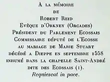 In a letter dated 30 October 1557, Henry of France requested that the Scottish parliament send commissioners to prepare for the wedding of Queen Mary to the Dauphin of France—nine commissioners including Robert Reid were appointed to negotiate the wedding treaty.[57] [note 3] On 6 February 1558—the day that he embarked for France—Reid concluded his last will and testament that allowed for a sum of 8000 merks to be used for the formation of a college in Edinburgh.[note 4][note 5] Reid embarked on one of the ships of a small flotilla that had been assembled to transport the commissioners, personages with their horses and gifts for the wedding. The weather was poor and even before they had left Scottish waters, one of the ships transporting the horses foundered and sank—another ship whose master was a Captain Watterton was wrecked as it approached the French coast with the loss of many gentlemen and valuable cargo.[60] Reid and his fellow commissioner, the Earl of Rothes, were themselves shipwrecked near Boulogne and were rescued by a French fishing boat.[5] On 11 April Bishop Reid and his fellow commissioners agreed on the marriage contract that protected Scotland's rights—this contract prevailed despite an attempt by the French to subvert the final outcome by obtaining an agreement directly with Queen Mary to Scotland's detriment.[61] Mary's wedding took place on 24 April at Notre Dame Cathedral—the scene of her father's wedding to Madeline twenty-one years earlier.[62] An altercation took place between the council of France and the Scottish commissioners when the French demanded that the Regalia of Scotland be immediately sent to France so that the Dauphin could be crowned King of Scotland. Reid and his fellow commissioners refused by explaining that they had no mandate from the parliament of Scotland to agree to such terms.[63] Displeased with this response, the French king prepared a letter of persuasion to the regent that two of the commissioners would deliver. In the meantime, the other commissioners were kept back until the French were certain that the letter was successfully delivered—only at this point could Reid return to Scotland.[64] Reid arrived at Dieppe at the end of August and started for home, only to be driven back in a gale, but by this time the bishop and four other commissioners were very ill. They all died but Reid was the first on 6 September 1558 and was buried in the Chapel of St Andrew in the Church of St Jacques, in Dieppe.[65]