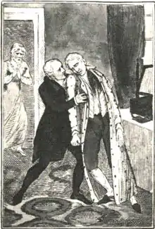 Castlereagh discovered the deal in September 1809 and demanded redress. He challenged Canning to a duel, which Canning accepted. Canning had never before fired a pistol. The duel was fought on 21 September 1809 on Putney Heath.[30] Canning missed but Castlereagh wounded his opponent in the thigh. There was much outrage that two cabinet ministers had resorted to such a method, and they both felt compelled to resign from the government. Six months later, Canning published a full account of his actions in the affair, and many who had initially rallied to him became convinced Castlereagh had been betrayed by his cabinet colleague.[31]