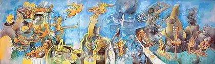 Matta's connections with Breton's surrealist movement were severed following a private disagreement concerning Arshile Gorky and his family. Matta was accused of indirectly causing Gorky's suicide (in response to Matta's relationship with the Armenian-American painter's wife). This led to his expulsion from the group, but by this time Matta's own name was becoming widely known. He divided his life between Europe and South America during the 1950s and 1960s, successfully combining the political and the semi-abstract in epic surreal canvases. Matta believed that art and poetry can change lives, and was very involved in the social movements of the 1960s and 1970s. He was a strong supporter of the socialist government of president Salvador Allende in Chile. A 4x24 meter mural of his entitled The First Goal of the Chilean People, was painted over with 16 coats of paint by the military regime of Augusto Pinochet following their violent overthrow of Salvador Allende in 1973. In 2005 the mural was discovered by local officials. In 2008 the mural was completely restored at a cost of $43,000, and is displayed today in Santiago at the La Granja city hall.[3]
