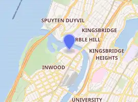 The field is located at the northern tip of the island of Manhattan, at 218th Street and Broadway. The close proximity of the Spuyten Duyvil Creek, which separates the island from the Bronx, means that the venue's center field fence is extremely shallow in comparison with its left and right field fences.[4][5]
