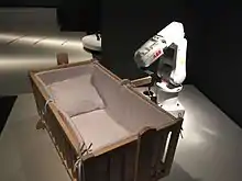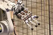 A robotic arm is a type of mechanical arm, usually programmable, with similar functions to a human arm; the arm may be the sum total of the mechanism or may be part of a more complex robot. The links of such a manipulator are connected by joints allowing either rotational motion (such as in an articulated robot) or translational (linear) displacement.[1][2] The links of the manipulator can be considered to form a kinematic chain. The terminus of the kinematic chain of the manipulator is called the end effector and it is analogous to the human hand. However, the term "robotic hand" as a synonym of the robotic arm is often proscribed.