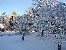 Rock Hill has a humid subtropical climate with four distinct seasons, characterized by hot humid summers and cool dry winters. The city itself is part of the USDA hardiness zone 7b with yearly minimum low temperature extremes between 5 °F (−15 °C) and 10 °F (−12 °C), typically occurring in the month of January.[16] Precipitation does not vary greatly between seasons, but is highly dependent on moisture supplied from the Gulf of Mexico. July is the hottest month, with an average high temperature of 91 °F (33 °C) and an average low temperature of 71 °F (22 °C).[17] The coldest month of the year is January, when the average high temperature is 51 °F (11 °C) and the average low temperature is 31 °F (−1 °C).[17] The warmest temperature ever recorded in the city was 106 °F (41 °C) in 1983 and tied in 2007.[17] The coldest temperature ever recorded in the city was −4 °F (−20 °C) in 1985.[17]