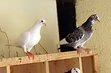 Wild rock doves are pale grey with two black bars on each wing, whereas domestic and feral pigeons vary in colour and pattern. Few differences are seen between males and females.[5] The species is generally monogamous, with two squabs (young) per brood. Both parents care for the young for a time.[6]