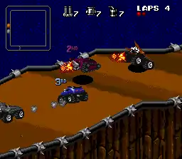 While it is a racing game, there is heavy emphasis on attacking competitor's vehicles; since the cars always reappear with full health just a few seconds after blowing up, the only "harm" done is falling behind in the race. Players are rewarded with a monetary "attack bonus" each time they provide the finishing blow against another car using their forward or rear weapons (and a similar "lapping bonus" when they gain a full one-lap lead on an opponent during the race). In accordance with the continual destruction and restoration of the racing vehicles, the tracks are littered with mines and health power-ups, as well as money power-ups. Other hazards include oil slicks, snow drifts, and lava, depending on the planet hosting the race.