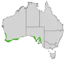 The rock parrot occurs along the coastline of southern Australia in two disjunct populations. In South Australia, it is found as far east as Lake Alexandrina and Goolwa, though is rare in the Fleurieu Peninsula. It was reported further east at Baudin Rocks near Robe, South Australia, in the 1930s, though not since. It is more common along the coastline of the northeastern Gulf St Vincent between Lefevre Peninsula and Port Wakefield, and Yorke Peninsula across Investigator Strait to Kangaroo Island, the Gambier Islands, and the Eyre Peninsula from Arno Bay to Ceduna and nearby Nuyts Archipelago. In Western Australia it is found from the Eyre Bird Observatory in the east, along the southern and western coastline to Jurien Bay Marine Park, becoming less common further north to Kalbarri and Shark Bay. Historically, it has been reported from Houtman Abrolhos.[17] The rock parrot is generally sedentary, though birds may disperse over 160 km (100 mi) after breeding. Some do remain on the offshore islands where they breed year-round.[18]