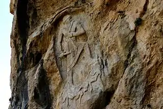 A rock relief or rock-cut relief is a relief sculpture carved on solid or "living rock" such as a cliff, rather than a detached piece of stone. They are a category of rock art, and sometimes found as part of, or in conjunction with, rock-cut architecture.[1] However, they tend to be omitted in most works on rock art, which concentrate on engravings and paintings by prehistoric peoples. A few such works exploit the natural contours of the rock and use them to define an image, but they do not amount to man-made reliefs. Rock reliefs have been made in many cultures throughout human history, and were especially important in the art of the ancient Near East.[2] Rock reliefs are generally fairly large, as they need to be in order to have an impact in the open air. Most of those discussed here have figures that are over life-size, and in many the figures are multiples of life-size.