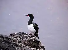 The rock shag (Phalacrocorax magellanicus), also known as the Magellanic cormorant, is a marine cormorant found around the southernmost coasts of South America. Its breeding range is from around Valdivia, Chile, south to Cape Horn and Tierra del Fuego, and north to Punta Tombo in Argentina. In winter it is seen further north, with individuals reaching as far as Santiago, Chile on the west coast and Uruguay on the east. The birds also breed around the coasts of the Falkland Islands.