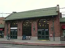 Because the entrance is at street level, the station is ADA accessible without the use of an elevator or ramps.[15] The station house is made of concrete with windows and plywood walls and a brick exterior. It also has an entrance leading to an adjacent restaurant.[16] An examination of the station house shows the former ticket windows, which were used when the line was part of the LIRR. The station houses Transit Police District 23,[16] which was moved to the station in June 1977.[17] A new police facility was opened on September 18, 2009.[18][19][20][21] A NYCDOT municipal parking lot lies just north of the station.[16][22]