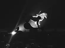 "Rocket" was performed live for the first time by Beyoncé during the 2014 MTV Video Music Awards on August 25, as part of a medley consisting of songs from her self-titled album. For the rendition of the song, the singer danced atop a chair, surrounded by smoke on stage.[72] She performed the same dance choreography seen in the music video for "Partition".[73] Beyoncé was dressed in a jeweled bodysuit and performed "Rocket" as the seventh song on the set.[72] Mike Wayers writing for The Wall Street Journal noted that the performance of the song was during the medley's "sexiest part".[74] Following the song's live performance, its sales in the US increased by 584%.[75] In 2016, "Rocket" was performed live throughout The Formation World Tour. During the track, a line of "Untitled (How Does It Feel)" was implemented and Beyoncé performed a chair dance.[76][77]
