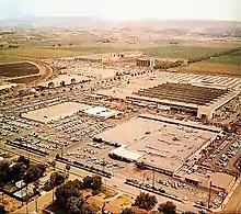 North American Aviation's rocket development activities began with engine tests nearby the Los Angeles Airport. In 1948, NAA began testing liquid rocket engines within the Simi Hills which would later become the Santa Susana Field Laboratory. The company sought a location for a manufacturing plant nearby the Simi Hills testing site. In 1954, North American Aviation purchased 56 acres of land within the current Warner Center area then deeded the property to the Air Force. The Air Force, in turn, designated the site Air Force Plant No. 56 and contracted with Rocketdyne to build and operate the facility.[3] NAA completed construction of the main manufacturing building and designated Rocketdyne as a new company division in November 1955.[4]