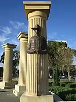 The memorials main feature are its thirteen classical styled columns, one for each major conflict Australia participated in. The 5.5 metre tall columns are arranged in a circle of a diameter of 30 metres. A fourteenth column socket has been left empty to commemorate Australian soldiers missing in action. The three branches of the Australian Defence Force, Army, Air Force and Navy, are represented by a QF 25-pounder field gun, a propeller and an anchor. The entrance to the memorial is guarded by two bronze soldiers, created by Perth sculptor Andrew Kay. Each weights 160 kilograms and is double the human size.[2]