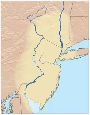 Rockland County lies just north of the New Jersey-New York border, west of Westchester County (across the Hudson River), and south of Orange County. Its east border is formed by the Tappan Zee portion of the Hudson River.[8] The county's terrain ranges from 1,283' (391m) ASL on Rockhouse Mountain (northwest of Lake Welch)[9] to approaching sea level along the Hudson River. According to the US Census Bureau, the county has a total area of 199.34 sq mi (516 km2), of which 173.55 sq mi (449.49 km2) are land and 25.79 sqmi (66.80 km2) (13%) are covered by water.[10] It is the state's smallest county outside the five boroughs of New York City.