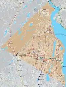 Rockland County is the southernmost county on the west side of the Hudson River in the U.S. state of New York, part of the New York City metropolitan statistical area. It is a suburb of New York City that is about 6 miles (9.7 km) from the Bronx at their closest points. The county's population, as of the 2010 United States Census, was 311,687, increasing to a 2019 Census estimate of 325,789,[1] making it the third-most densely populated county outside New York City within New York (after Nassau and neighboring Westchester Counties, respectively). The county seat is New City.[2] Rockland County is accessible via the New York State Thruway, which crosses the Hudson to Westchester at the Tappan Zee Bridge 10 exits up from the Bronx, as well as the Palisades Parkway, five exits up from the George Washington Bridge. The name derives from "rocky land", as the area has been aptly described.