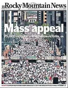 The Rocky Mountain News (nicknamed the Rocky[2]) was a daily newspaper published in Denver, Colorado, United States, from April 23, 1859, until February 27, 2009. It was owned by the E. W. Scripps Company from 1926 until its closing. As of March 2006, the Monday–Friday circulation was 255,427.[1] From the 1940s until 2009, the newspaper was printed in a tabloid format.