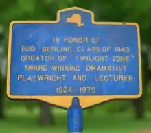 In elementary school, Serling was seen as the class clown and dismissed by many of his teachers as a lost cause.[2]:19–20 However, his seventh-grade English teacher, Helen Foley, encouraged him to enter the school's public speaking extracurriculars.[2]:19 He joined the debate team and was a speaker at his high school graduation. He began writing for the school newspaper, in which, according to the journalist Gordon Sander, he "established a reputation as a social activist".[2]:19