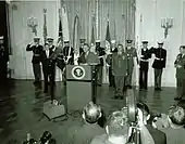For conspicuous gallantry and intrepidity at the risk of his life above and beyond the call of duty while defending a U.S. military installation against a fierce attack by hostile forces. Capt. Donlon was serving as the commanding officer of the U.S. Army Special Forces Detachment A-726 at Camp Nam Dong when a reinforced Viet Cong battalion suddenly launched a full-scale, predawn attack on the camp. During the violent battle that ensued, lasting 5 hours and resulting in heavy casualties on both sides, Capt. Donlon directed the defense operations in the midst of an enemy barrage of mortar shells, falling grenades, and extremely heavy gunfire. Upon the initial onslaught, he swiftly marshaled his forces and ordered the removal of the needed ammunition from a blazing building. He then dashed through a hail of small arms and exploding hand grenades to abort a breach of the main gate. En route to this position he detected an enemy demolition team of 3 in the proximity of the main gate and quickly annihilated them. Although exposed to the intense grenade attack, he then succeeded in reaching a 60mm mortar position despite sustaining a severe stomach wound as he was within 5 yards of the gun pit. When he discovered that most of the men in this gunpit were also wounded, he completely disregarded his own injury, directed their withdrawal to a location 30 meters away, and again risked his life by remaining behind and covering the movement with the utmost effectiveness. Noticing that his team sergeant was unable to evacuate the gun pit he crawled toward him and, while dragging the fallen soldier out of the gunpit, an enemy mortar exploded and inflicted a wound in Capt. Donlon's left shoulder. Although suffering from multiple wounds, he carried the abandoned 60mm mortar weapon to a new location 30 meters away where he found 3 wounded defenders. After administering first aid and encouragement to these men, he left the weapon with them, headed toward another position, and retrieved a 57mm recoilless rifle. Then with great courage and coolness under fire, he returned to the abandoned gun pit, evacuated ammunition for the 2 weapons, and while crawling and dragging the urgently needed ammunition, received a third wound on his leg by an enemy hand grenade. Despite his critical physical condition, he again crawled 175 meters to an 81mm mortar position and directed firing operations which protected the seriously threatened east sector of the camp. He then moved to an eastern 60mm mortar position and upon determining that the vicious enemy assault had weakened, crawled back to the gun pit with the 60mm mortar, set it up for defensive operations, and turned it over to 2 defenders with minor wounds. Without hesitation, he left this sheltered position, and moved from position to position around the beleaguered perimeter while hurling hand grenades at the enemy and inspiring his men to superhuman effort. As he bravely continued to move around the perimeter, a mortar shell exploded, wounding him in the face and body. As the long awaited daylight brought defeat to the enemy forces and their retreat back to the jungle leaving behind 54 of their dead, many weapons, and grenades, Capt. Donlon immediately reorganized his defenses and administered first aid to the wounded. His dynamic leadership, fortitude, and valiant efforts inspired not only the American personnel but the friendly Vietnamese defenders as well and resulted in the successful defense of the camp. Capt. Donlon's extraordinary heroism, at the risk of his life above and beyond the call of duty are in the highest traditions of the U.S. Army and reflect great credit upon himself and the Armed Forces of his country.[5]