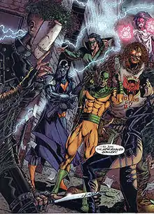 ![]() The Rogues, a group of modern Flash enemies (except for the Weather Wizard, third from left), who formed a team to take down the Flash, from Flash: Iron Heights (August 2001). | |