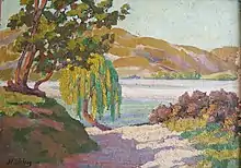 Hipkins took up the position of Art teacher at the Napier technical College in 1922 and helped establish the ‘Napier Society of Arts and Crafts’ in 1923.[4] Hipkins arrived in Napier in 1922 as one of a number of La Trobe artists brought to New Zealand to improve the teaching of art in the country. Other artists who came under the scheme included Robert Nettleton Field, Christopher Perkins and Francis Shurrock.[5]