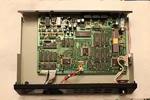 The LA32 sound generation chip is an 80-pin PGA. The control CPU is an Intel C8095-90 in ceramic DIP-48 package. The digital-to-analog converter (DAC) is a Burr-Brown PCM54; the input signal having a resolution of 15 bits (see below). Line-outs are unbalanced 1/4″ TS phone connector (separate left and right channels.) No headphone jack.